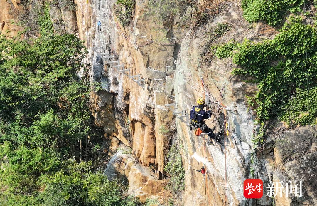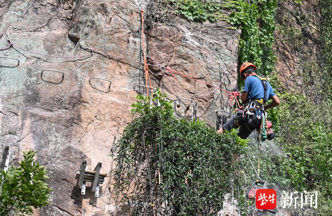 记者沿着渔湾景区珍珠瀑广场的山体一路向上,嶙峋的崖壁间传来阵阵电钻轰鸣。建设者们如蜘蛛人般悬在陡坡上,他们携带电钻等工具,腰间的扳手与岩壁碰撞出清脆声响,这幅“愚公移山”的画面正是渔湾景区正在建设的溯溪飞拉达,项目建成后,游客可以选择徒步游览、亲水户外体验、岩壁挑战、俯瞰渔湾全景等多种线路,带来特殊的登山体验。